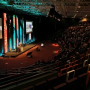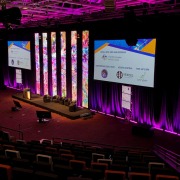VuePix Infiled LED mesh panels were set up at the main stage in the Royal Theatre, creating a vivid backdrop for all the speakers and presentations. The screens were suspended from the truss in 6 huge columns, each consisting of 20 panels. The EET team used their E12 mesh screen for this gig, as all of their other 2000+sqm of the VuePix Infiled screens were used on other productions at the same time. The investment in E12 panels was one of the first EET made in VuePix screens, over 10 years ago … “and they still perform flawlessly and look great on camera!” says Darren Russell, MD of EET.